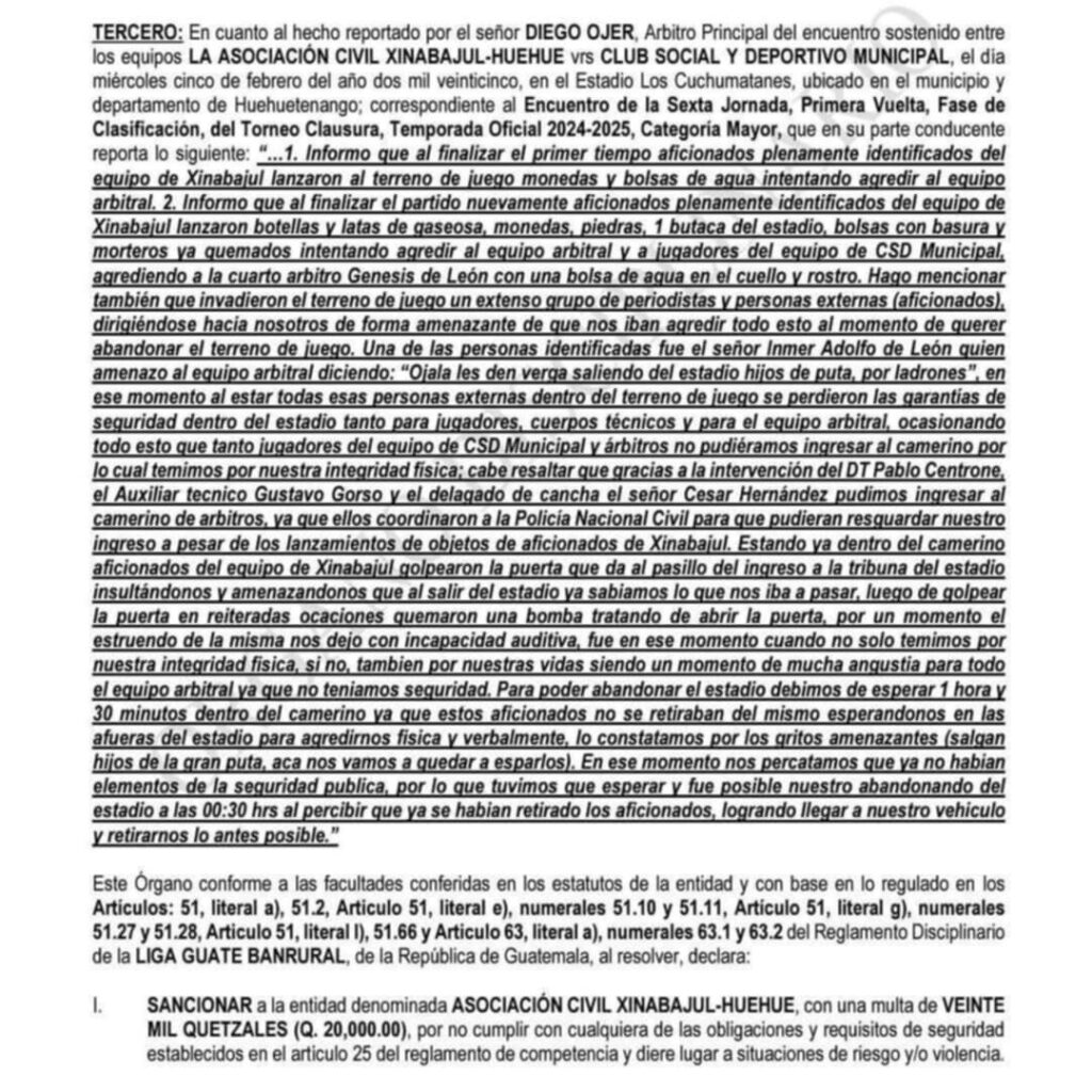 El Órgano Disciplinario de Liga Nacional sancionó con Q70 mil a Xinabajul-Huehue después del partido contra Municipal del miércoles recién pasado, donde los rojos se quedaron con el triunfo por 0-2 y válido por la sexta jornada del Torneo Clausura 2025.