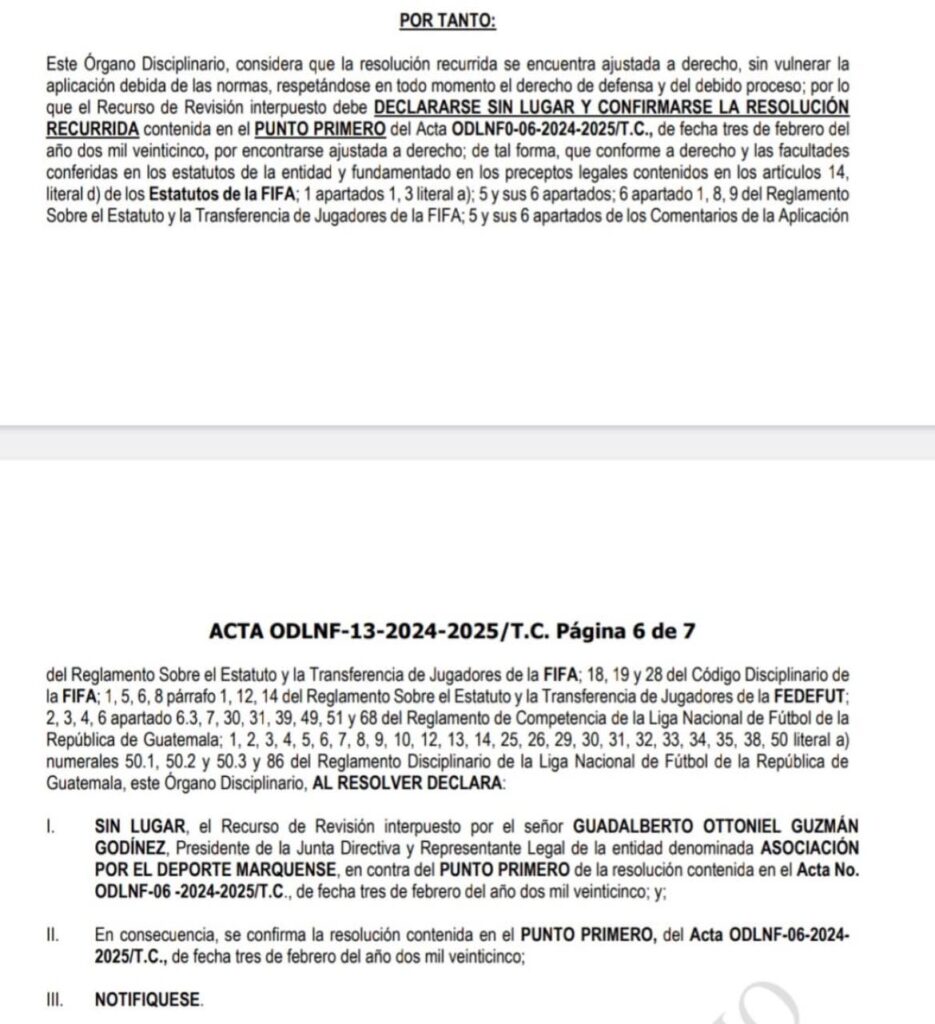 El Órgano Disciplinario de Liga Nacional volvió a declarar sin lugar el recurso de apelación presentado por la junta directiva del Deportivo Marquense en el caso del delantero argentino Ramiro Rocca, donde los leones buscan recuperar los tres puntos que perdieron en la mesa hace unos días.