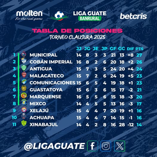 Después de la actividad de la jornada 16 del Torneo Clausura 2025, hay modificaciones en la tabla de posiciones y que dejan a Municipal como el nuevo líder.