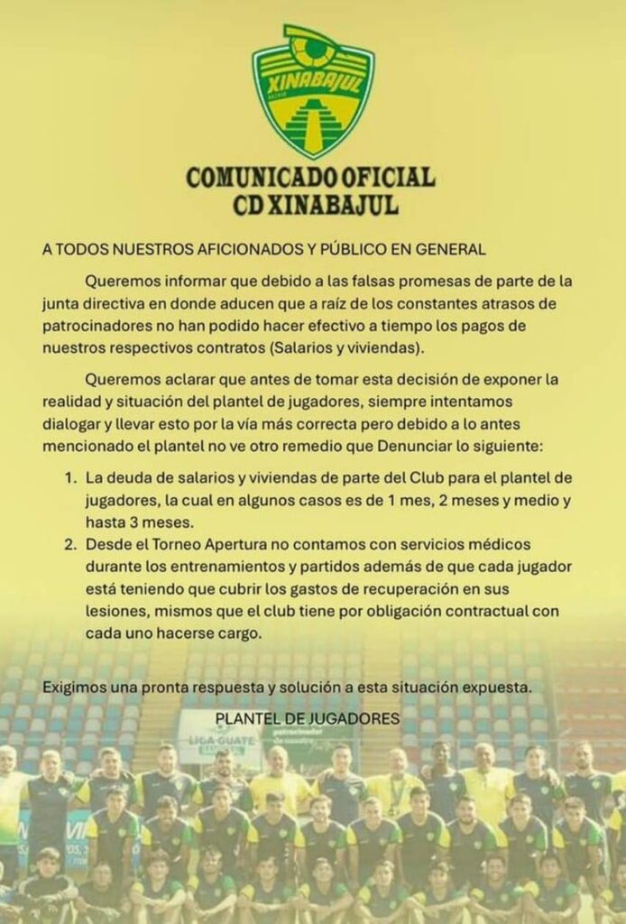 Este viernes los futbolistas del plantel mayor del cuadro de la X, emitieron un comunicado donde denuncian a la actual junta directiva debido a que no ha cumplido con las compresas hizo en su momento y esto ha afectado en la falta de pago de los salarios a los jugadores, quienes pasan constantes inconvenientes a la hora de pagar el alquiler de sus hogares.